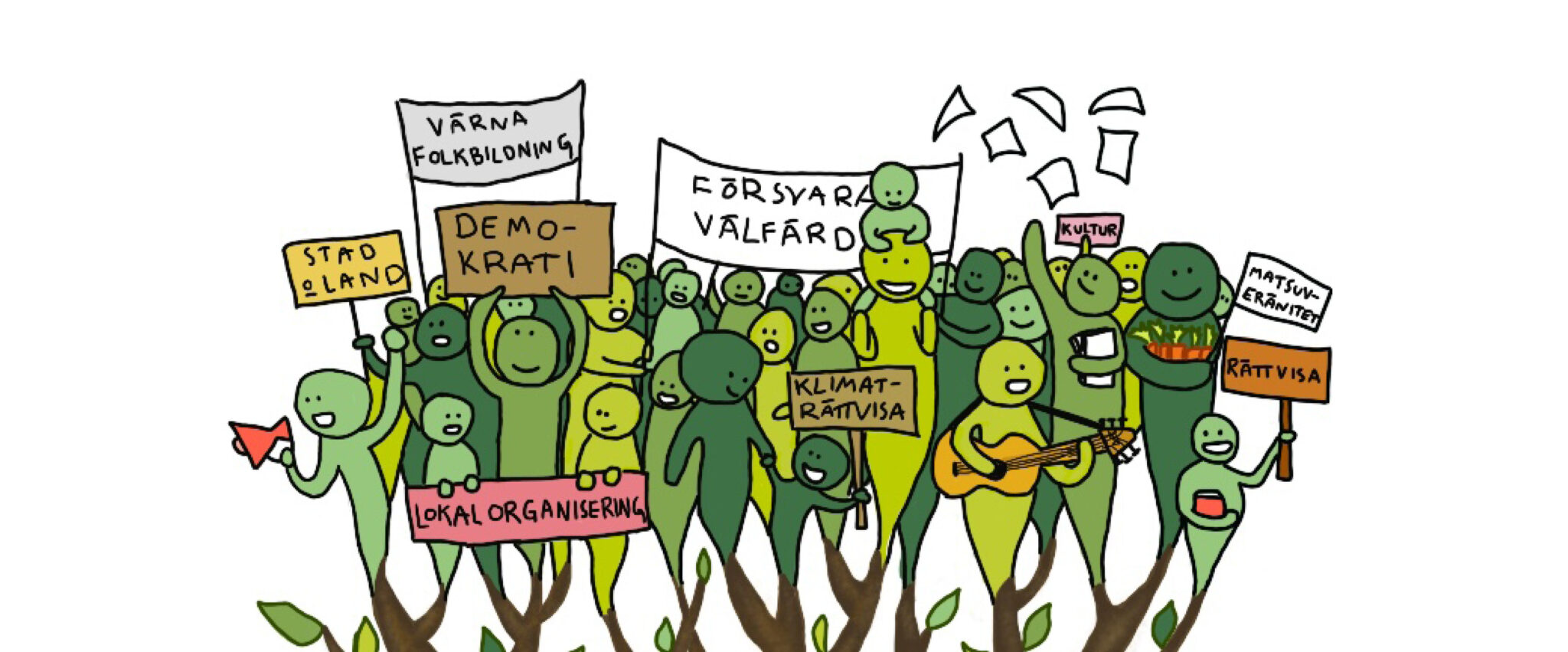 På vägen har stafetten samverkat med aktiva i klimat-/miljö- och människorättsrörelser, lokala matproducenter, folkhögskolor m.m., samt samlat in förslag på vad som behöver göras för att främja en väl fungerande demokrati och livskraftiga samhällen i hela landet.